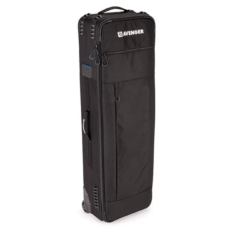 The ultra-tough, hardwearing case is designed for professional image-makers working on location, allowing them to transport all their essential C-Stand accessories in one convenient carrying solution. The external dimensions of 50.4in x 11in x 15.7in with a maximum load of 77.1 lbs allow for plenty of storage capacity. It can carry up to three turtle base (detachable) C-Stand kits and accessories, with high-density closed cell and cross-link foam dividers to create three sections for detachable C-Stand columns and a fourth section with adjustable reinforced straps to securely stow extension arms. It includes two removable padded storage trays, ideal for grip heads, clamps, and other small accessories. The shell of this rugged case is constructed from hard ABS honeycomb and durable water-resistant 900D Polyester, with high-quality YKK® RC zippers with molded grip pull cords throughout, with strong anti-abrasion protective reinforcement in key high wear areas, as well as durable rubber feet, bumpers and back rails to further protect the case when navigating uneven terrain and obstacles. The strong exterior padded handles on the top and side panels and replaceable shock-absorbing wheels allow for both single and two-person handling for ease of maneuverability on location. All of these features combined with the black finish, Avenger blue detailing, bold branding and crafted design make this all-in-one carrying solution stylish as well as functional and the perfect carrying solution for the creative image maker to arrive on set ready to roll!
