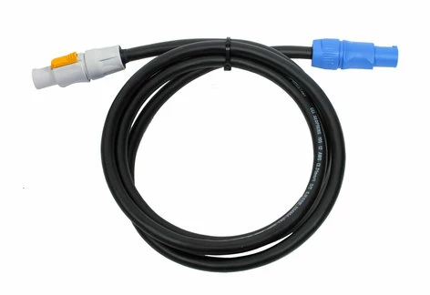 Powercon is a lockable 3-pole equipment (AC) connector with contacts for line, neutral, and premating safety grounds. It is rated at 20A/250V AC. Color-coded for easy identification, Powercon offers power-in (blue) and power-out (grey) versions with differing key structuring to avoid the possibility of intermating.