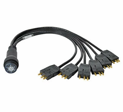 EverGrip 20 Amp, 6-circuit, 125 VAC, 12/3 SJOW-A, break-in, molded female Inline LSC19 to (6) 20 Amp stage pin plugs.